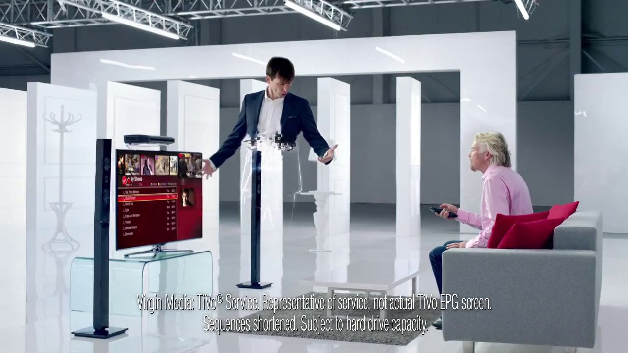 Multiple passes were shot with and without David Tennant so in the final edit David is disappearing and reappearing on Richard Branson’s lap. The Titan was used as the only motion control arm long enough to create the size of arc that was required.